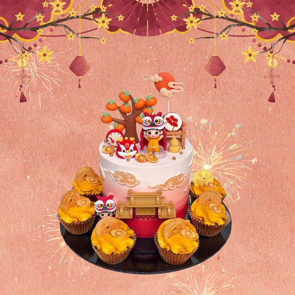 Celebrate in style with our Prosperous Celebration Cupcake Set, which includes a 1.0kg Huat Huat themed cake and 10 perfectly themed cupcakes. All images shown are for illustration, the cake may vary slightly from the website's images.