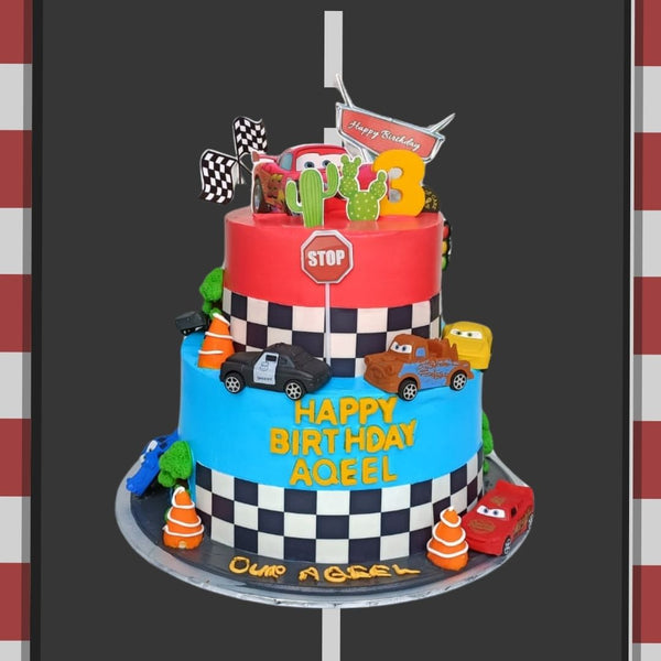 Celebrate the next joyous occasion with the Two-Tier McQueen Race Track cake designed by Take A Bake. It is the ideal Lightning McQueen cake for your little fan's birthday celebration. All images shown are for illustration; the cake may vary slightly from the website's images.