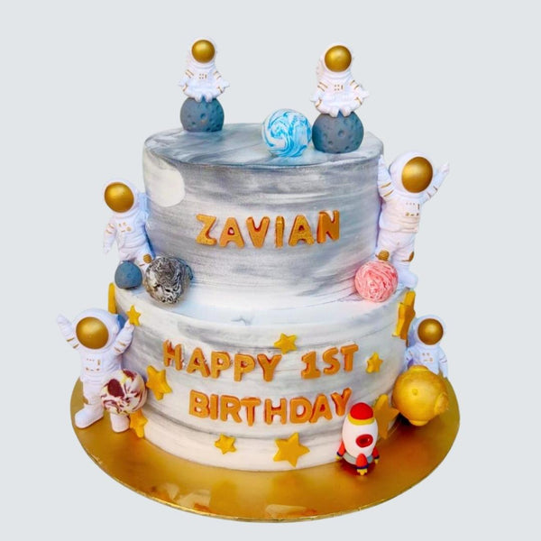 Celebrate the next joyous occasion with the Two-Tier Space Explorers cake designed by Take A Bake. This Two-Tier Space Explorers cake is the ideal astronaut-themed cake for a space-themed birthday celebration. All images shown are for illustration; the cake may vary slightly from the website's images.