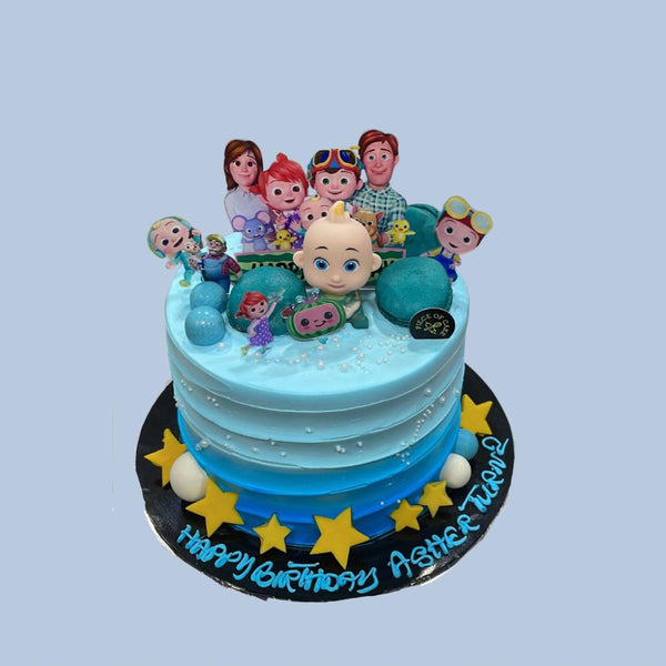 Celebrate your special moment with the Baby JJ Celebration cake designed by Take A Bake. It is ideal for Cocomelon and Baby JJ fans' birthday parties! All images shown are for illustration; the cake may vary slightly from the website's images.