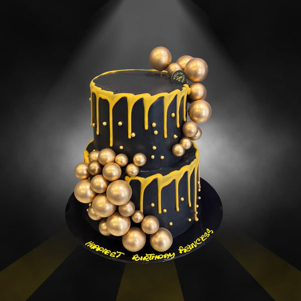 Celebrate the next joyous occasion with the Two-Tier Black & Gold Luxe Cake. All images shown are for illustration; the cake may vary slightly from the website's images.