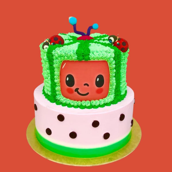 Celebrate your special moment with the Two-Tier Cocomelon Greetings Cake designed by Take A Bake. It is ideal for Cocomelon and Baby JJ fans' birthday parties! All images shown are for illustration; the cake may vary slightly from the website's images.